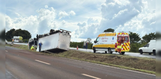 Caminhão-baú capota na BR-376 e deixa motorista preso às ferragens