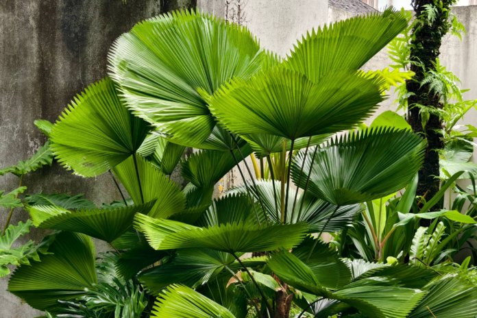 A palmeira-leque (Licuala grandis) é uma espécie ornamental de folhas largas e plissadas, muito usada na decoração de interiores.