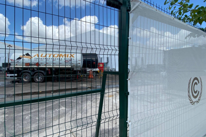 Esses caminhões carregam milhares de litros de óleo diesel para abastecer 160 geradores para fornecer eletricidade ao pavilhão onde as negociações climáticas acontecerão. O diesel é um dos combustíveis fósseis que mais emitem gases do efeito estufa.