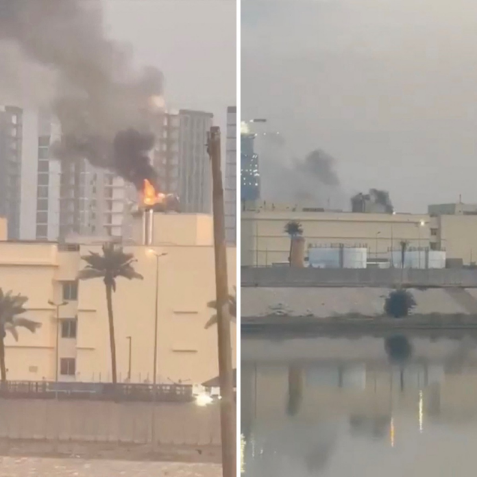 Fumaça sobe do prédio da embaixada dos EUA, em Bagdá, no Iraque, neste sábado (14)