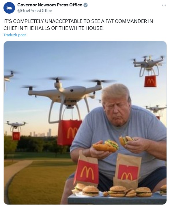 Newsom reagiu publicando no X o vídeo do discurso de Hegseth acompanhado de uma foto de Trump em um McDonald’s, tirando o paletó. Na legenda, o democrata ironizou: “Acho que o Comandante em Chefe precisa ir embora!”.