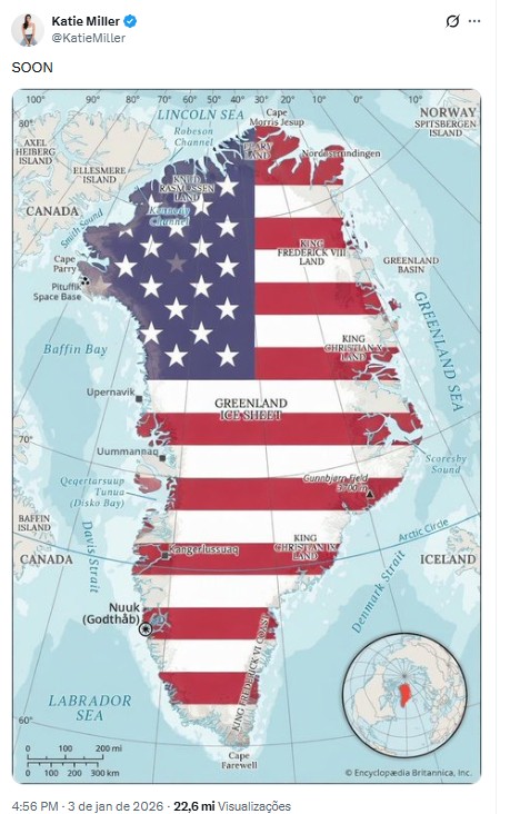 Katie Miller posta mapa Groenlândia com bandeira dos EUA