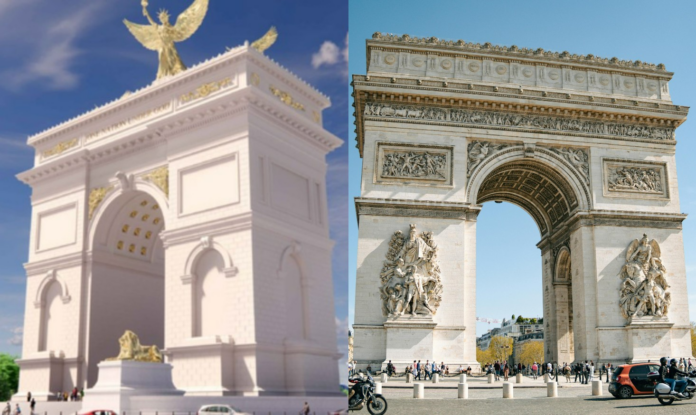 Desenho do projeto do Arco do Triunfo dos EUA (à esqueda); Arco do Triunfo, em Paris (à direita)