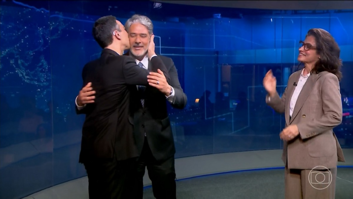Ao final do telejornal, o veterano recebeu Cesar Tralli na bancada para se juntar com Renata Vasconcellos, ondeu deu as boas-vindas calorosas ao sucessor.