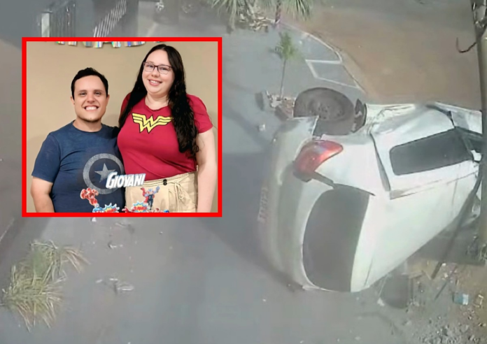 Nas imagens, é possível ver o Sandero se aproximando em alta velocidade, quando é atingido por uma Mercedes-Benz que seguia na via transversal. Com o impacto, o carro do casal capota, bate violentamente em um poste de iluminação pública e fica completamente destruído. Eles morreram na hora.